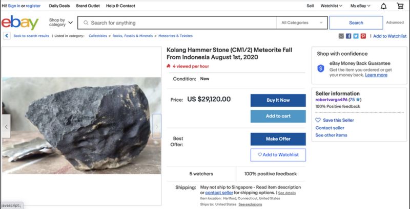 当然也有期望很高,但最后卖了个白菜价的,比如2020年8月1日,印尼苏门答腊一个村庄的棺材铺中正在劳作的乔苏亚·哈塔加隆(Josua Hutagalung)捡到了一块陨石,总重量2.1千克,成分是碳质球粒陨石,据说价值高达180万美元,当时在ebay上挂的价格就是如此。