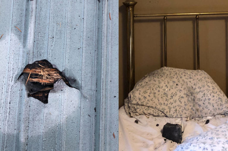 巨响发生后,露丝·汉密尔顿显然是被惊醒了,惊恐地打开灯后发现屋顶已经破了一个大洞,而在她的枕边却多了一块石头,手摸上去还是温温的,似乎还冒着热气!