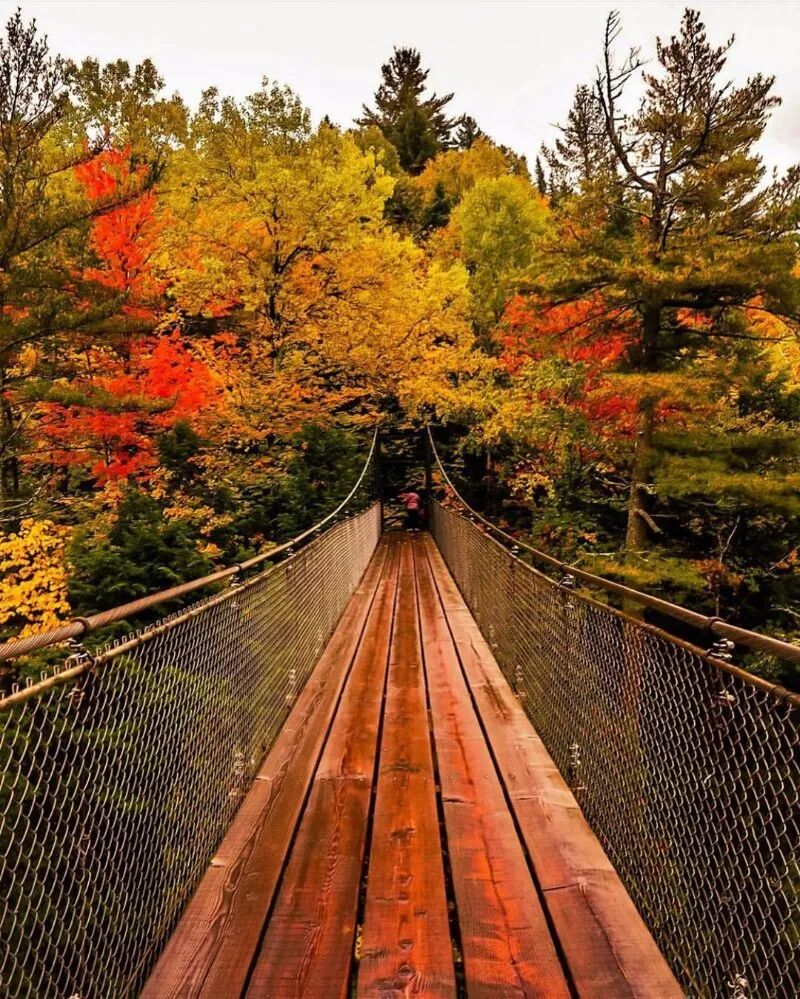 高高低低错落的吊桥穿梭于红色,金黄,橘黄和绿色的斑斓森林之中,下面为湍急曲折的河流,听着淳淳流水,眼看五彩世界,感受无限的野外乐趣和刺激。