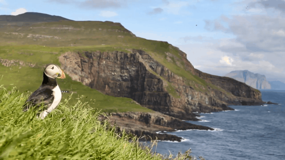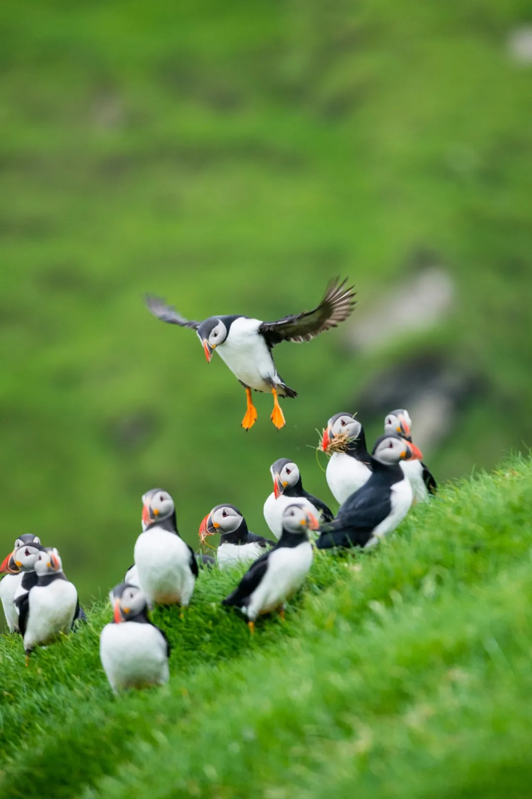 最西边的麦凯岛(Mykines)也是观鸟者的天堂,这里有如世界尽头,岛上只有不到15个常驻居民和一家住宿,需搭乘直升飞机(提前预约,10分钟)或长途车前往。通往岛上标志性建筑物Mykineshoĺmur灯塔的徒步路线会经过北极海鹦的洞穴,你可以近距离观赏这种呆萌的动物。