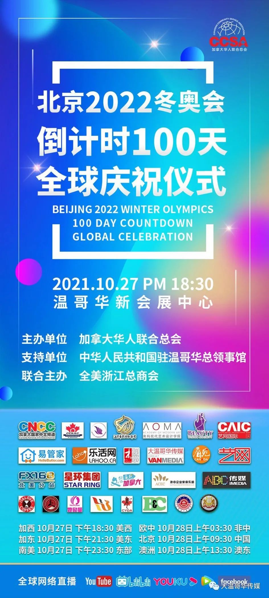 北京2022冬季奥林匹克运动会的脚步临近了,加拿大华人联合总会将在2021年10月27日举行助力北京2022冬季奥运会倒计时系列活动,号召华人社区支持北京2022冬奥会和冬残奥会,积极营造海外北京2022冬奥氛围。同时进行现场直播,在全球多个主要城市进行联动,让全世界的朋友更多的了解北京冬奥,让全球的观众能共襄盛举,活动完全遵照当地政府活动要求。