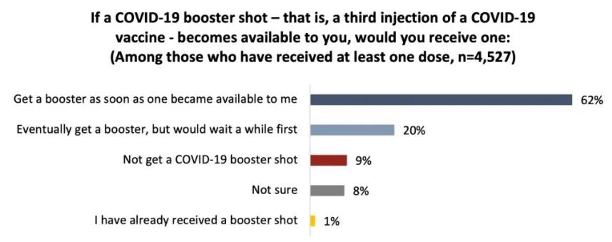 Angus Reid Institute还询问了至少接种了一针疫苗的受访者,是否愿意接种第三针疫苗,结果哦显示62%的人表示愿意在提供第三针接种后,立即接种第三针,20%的人表示想等一等再接种。已接种疫苗者中,只有9%表示不会接种第三针。