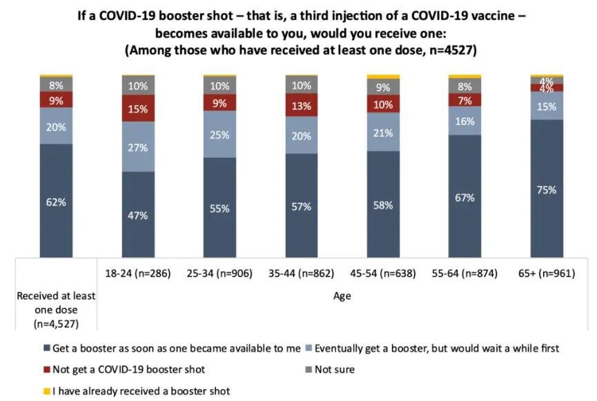 另外,年长的受访者接种第三针的意愿强于年轻人,65岁以上人群75%愿意接种第三针,而25-34岁的年轻群体中有55%愿意接种第三针。