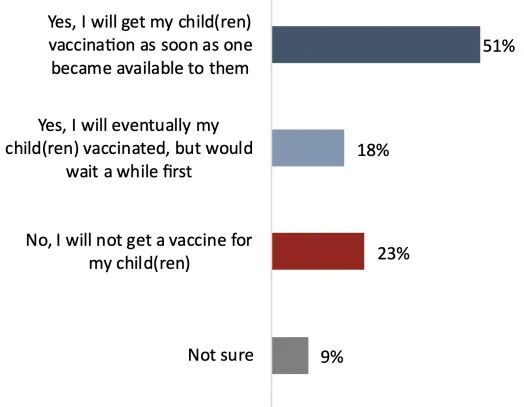9月29日至10月3日,Angus Reid Institute通过网络对5,011名加拿大人进行了调查。民调显示,和成年人接种率分部情况类似,不同省份儿童接种的意愿也有差别。卑诗省、安省和大西洋地区只有15%的家长表示不会让5-11岁的孩子接种疫苗,但阿省、萨省和魁省,有30%的家长不会让孩子接种。