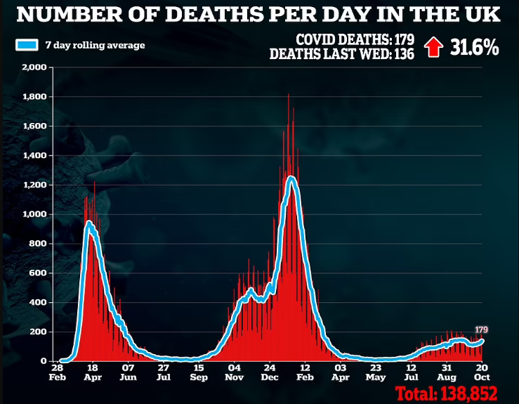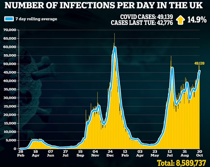 本周一,英国宣布单日确诊49156例,是7月以来的最高数字,而英国在过去一周的确诊人数也比前一周高出16%。