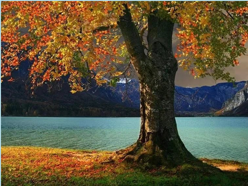 及至深秋,金风如剪,大自然化妆师开始卸妆,修剪打薄,将青丝漫撒轻抛,五彩树叶点缀绿茵草地,彩色锦缎一般,使人不忍下脚。
