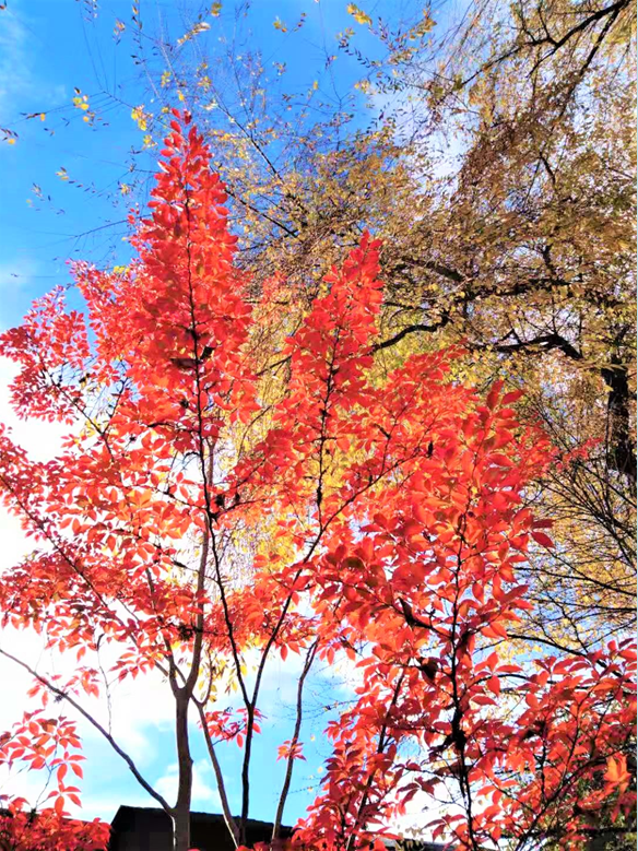 连日阴雨后放晴,道旁的枫树在阳光下灿烂夺目,心中雾霾为之一扫。