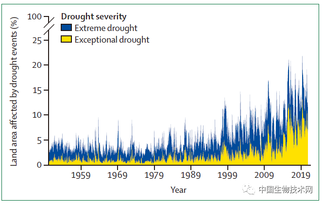 在2020年的任意一个月里,全球19%的陆地受到极端干旱的影响。气候变化正在增加干旱事件的频率、强度和持续时间。这些变化对饮用水安全、卫生,以及粮食生产和安全构成威胁,并增加了野火和环境暴露在污染物中的风险。