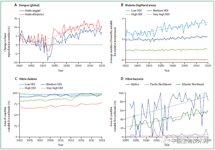更多人生活在气候敏感、疾病肆虐的地方 过去10年,在波罗的海、美国东北部和太平洋西北部的海岸线地区,高温足以使这些地区滋生各种病毒和细菌,例如登革热和弧菌。在一些较贫穷的国家,自20世纪50年代以来,传播疟疾的季节已经延长。