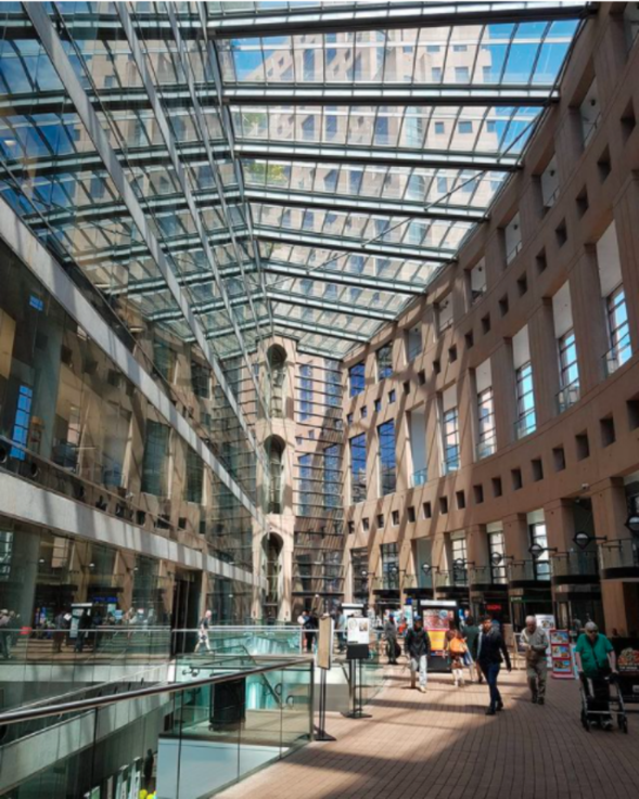 重建后的新馆于2014年12月开放,是一个非常受欢迎的聚会场所,提供了一系列便利设施,包括咖啡馆、礼堂和社区活动室。引人注目的建筑特点是五楼入口处的悬挑结构、楼梯纵横交错的中庭,以及建筑的幕墙带来的光学效应和与城市环境的关系。