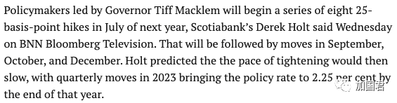 丰业银行的霍尔特今天(10月20日)周三在 BNN 彭博社电视台表示,以加拿大央行行长蒂夫·麦克莱姆为首的政策制定者将在明年7月开始加息,并且连续八次加息 25 个基点,从0.25%加到2.25%。