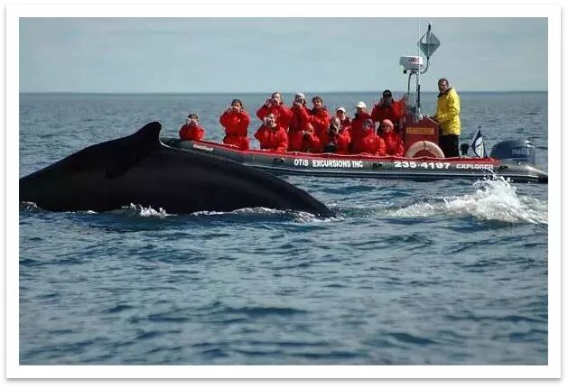 小快艇(Zodiac)是最受欢迎的一种观鲸方式。这种船的优点是体积小,速度快,噪音小,可近距离观鲸。而且船上配有声纳仪,可准确定位鲸鱼位置,甚至判断鲸鱼种类。缺点是通常一次只能装几十人,舒适性差,比较寒冷,需穿保暖性强的衣服,甚至要穿雪衣雪裤,帽子围巾和手套。此快艇6岁以下儿童、孕妇及后背有问题的人士不可乘坐。
