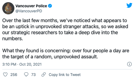 温哥华的“随机伤人案”也有所增加。温哥华警局表示,从2020年9月1日到2021年8月31日,总共报告了大约1,555起陌生人袭击事件,涉及1,705名受害者。平均每天4起。而且这些袭击中有47%都涉及武器。