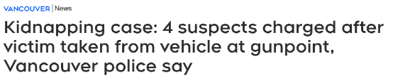 10月21日,温哥华警方还通报了另一起恶性案件。4名暴徒光天化日公然持枪劫持了一名列治文居民。受害人被抢指着头从车上带走,并收到殴打和捆绑,身受重伤。