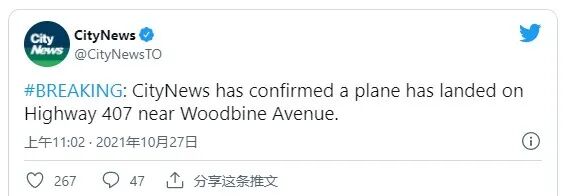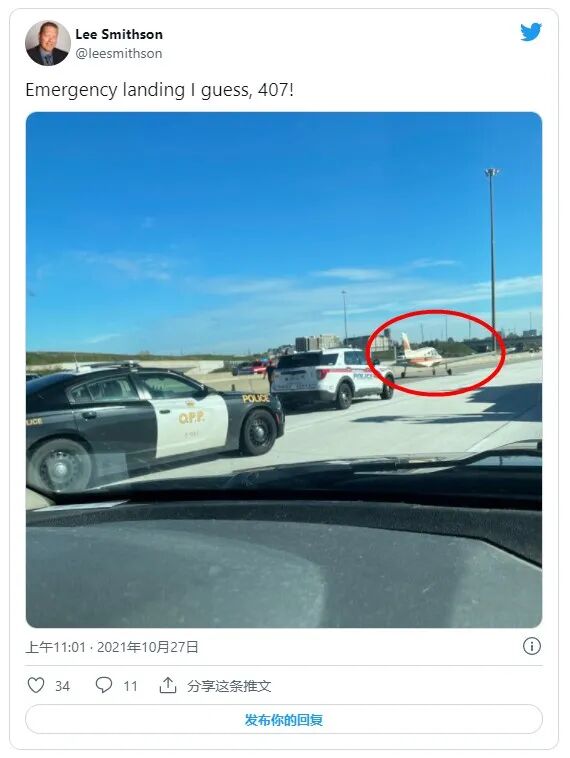 紧急迫降在Hwy407高速公路上,