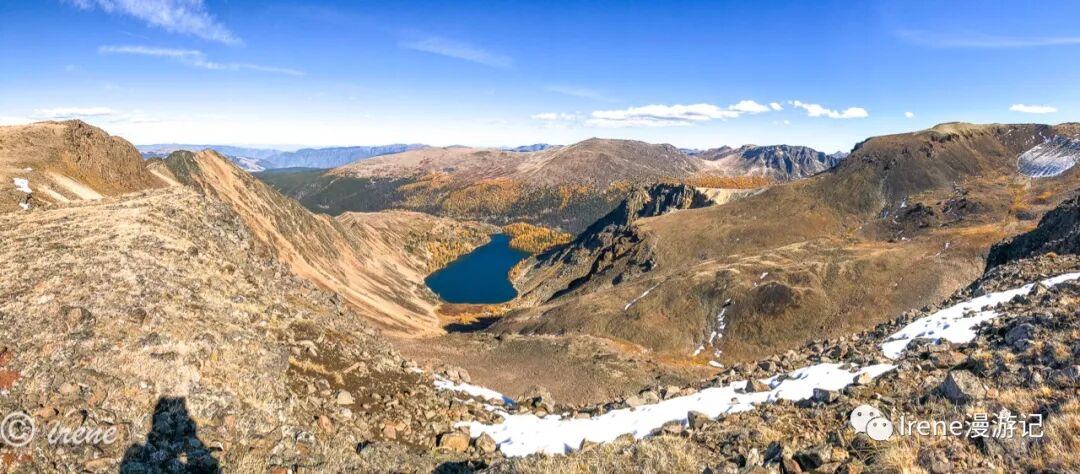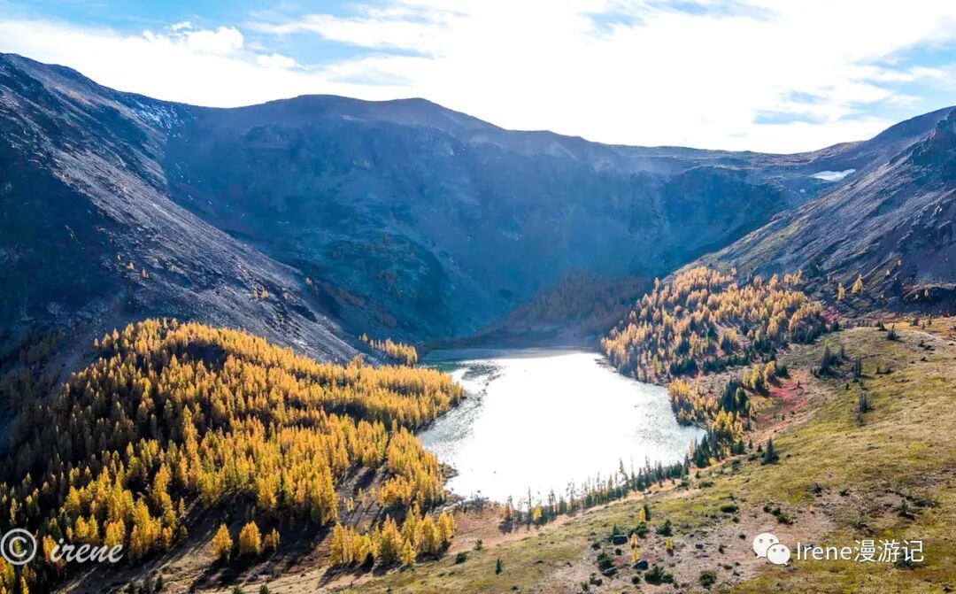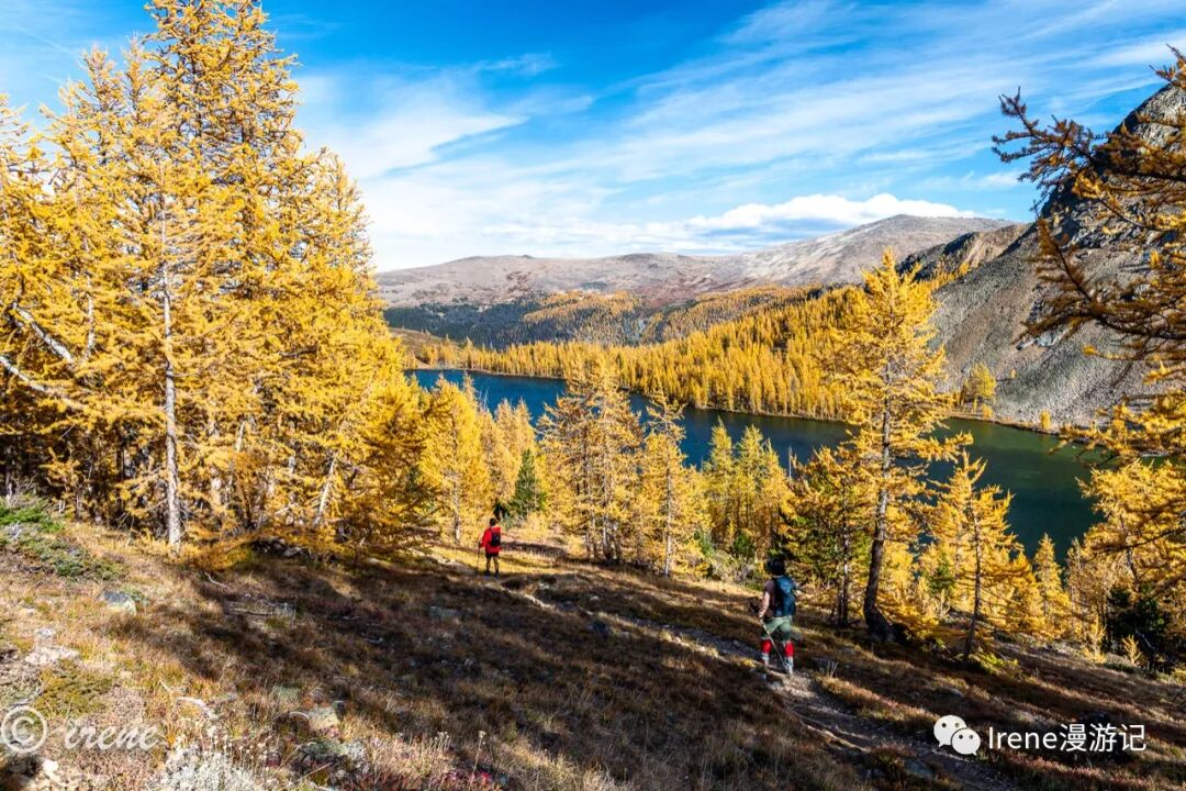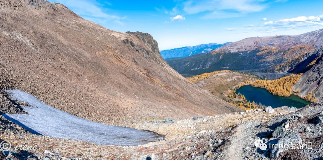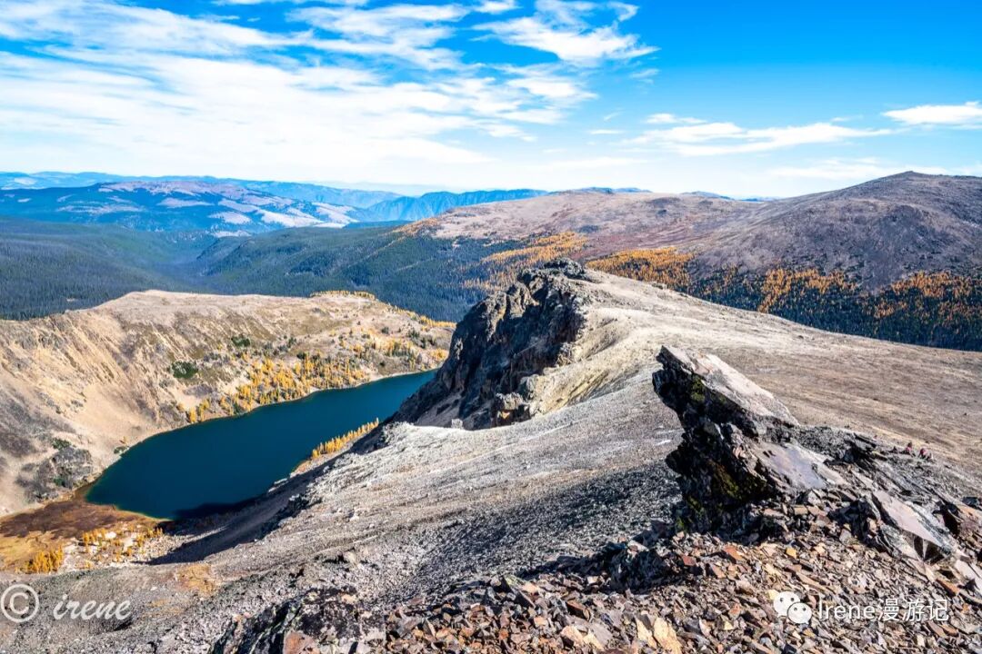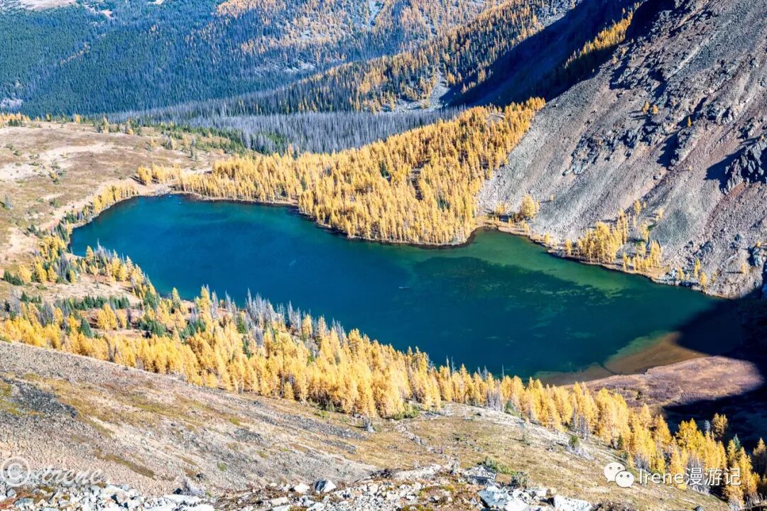 天上开始飘起了小雨,对面五六个山中的湖泊一致排开,金松秋色正浓,然而雨雾袭来,没有了光线美景顿时失色,我们也匆匆赶路,手机一扫,无暇停留。