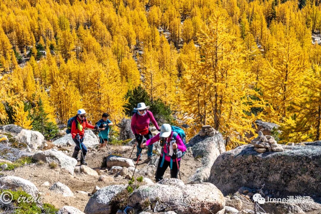 向金松开拔,一路不断的爬升,突然就闯进了金松林,正值全盛时期,金光灿烂迷人眼啊。看金松也是机遇,盛期就那么几天,早了绿色还不愿离去,晚了金针又掉光了,幸运哈。