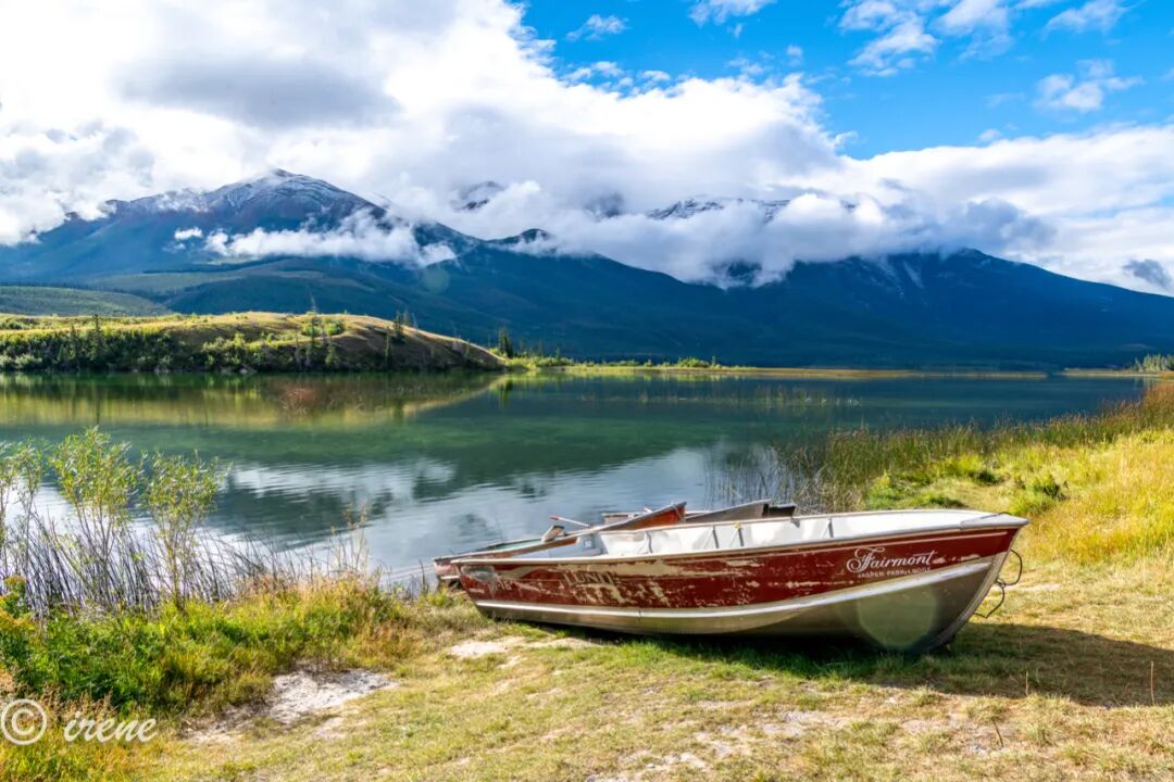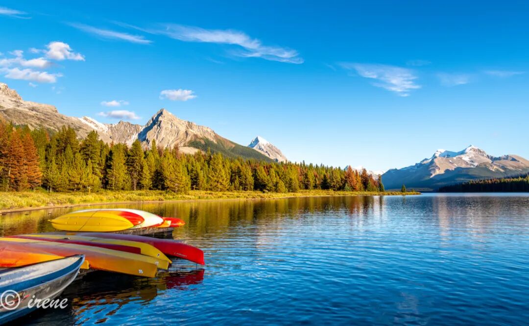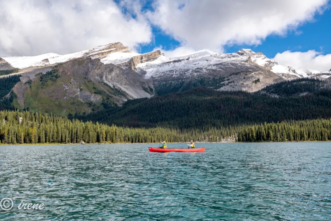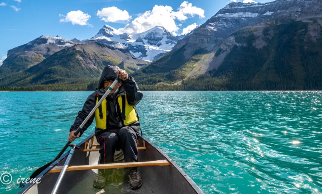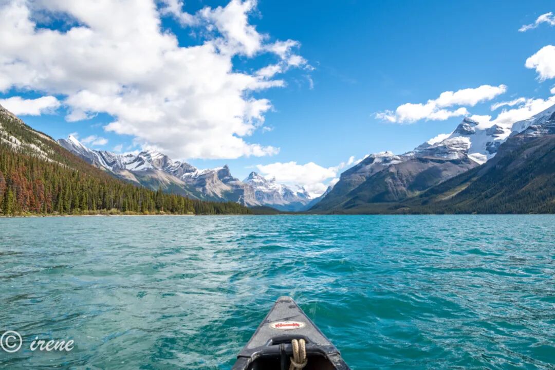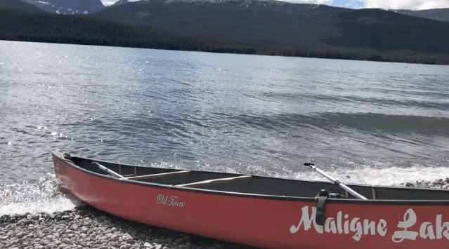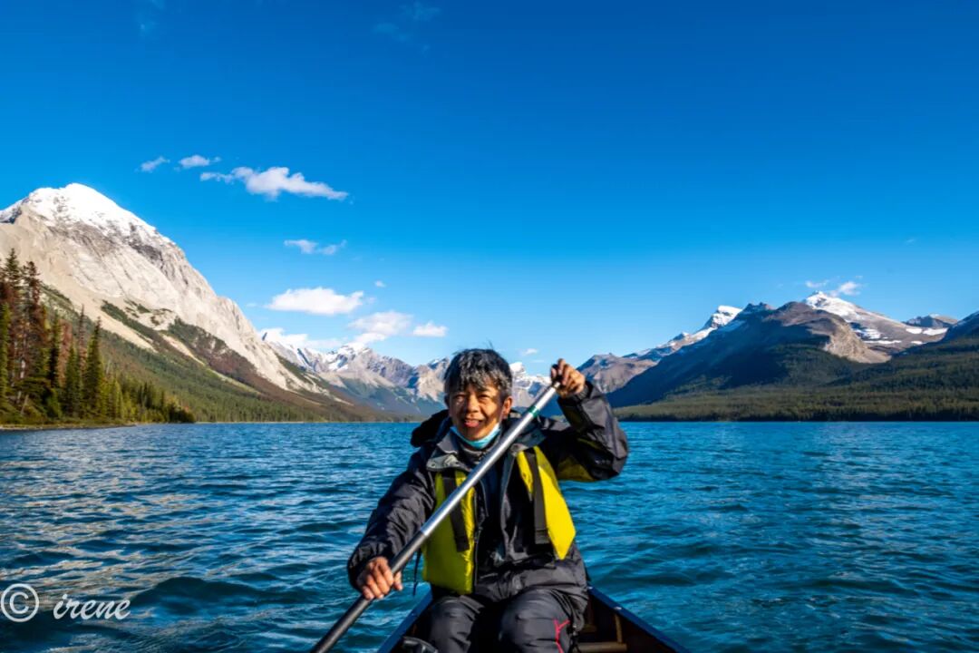 这次要换一个角度,荡舟湖上是个不错的选择,Maligne Lake 是这个区域最大最美的湖,二十几公里雪山冰川森林环绕。租了一天的独木舟(Canoe),悠哉悠哉的下水了。