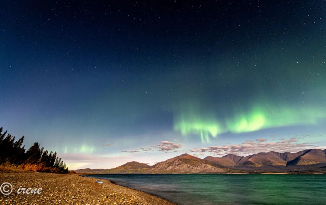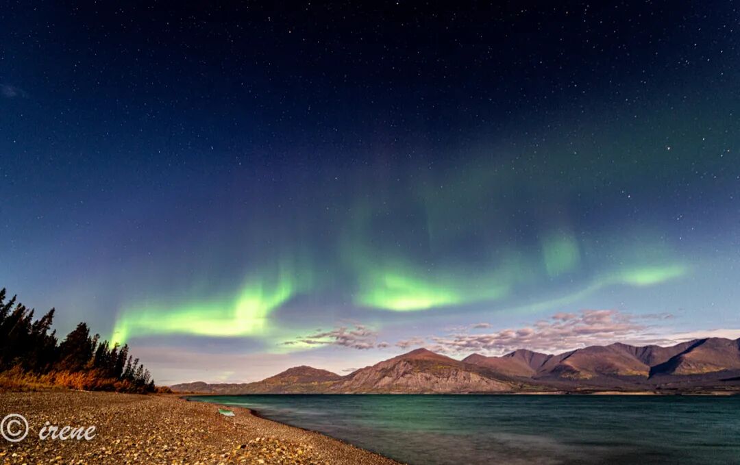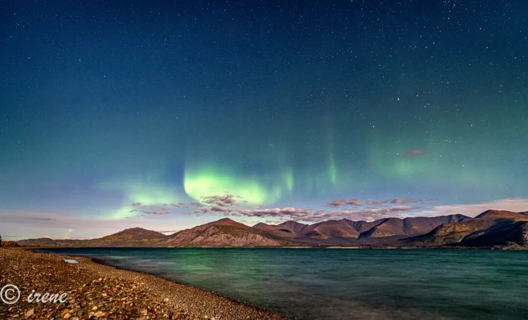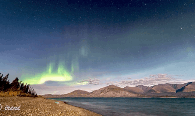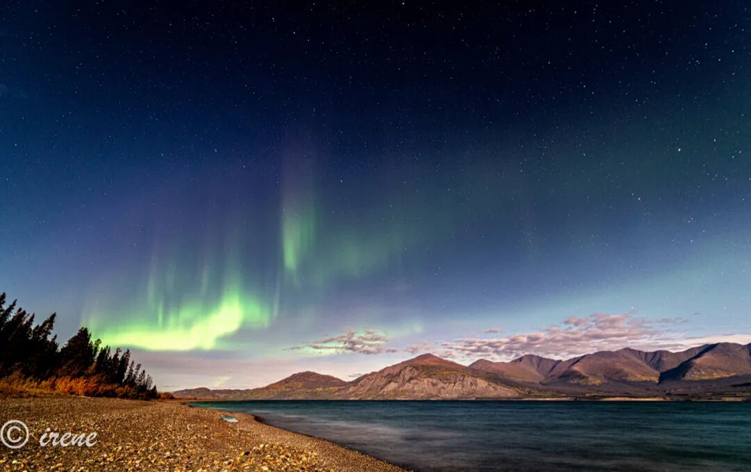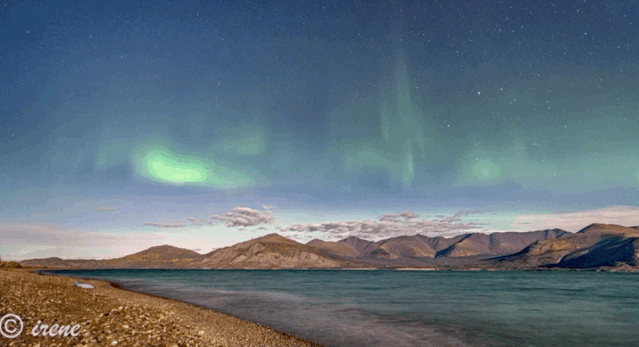 半天才想起抄家伙奔湖岸而去,一群小精灵挥舞着彩练在湖的上空轻歌曼舞,让人如痴如醉。如果是无月的暗夜,今天的极光更是靓瞎双眼。
