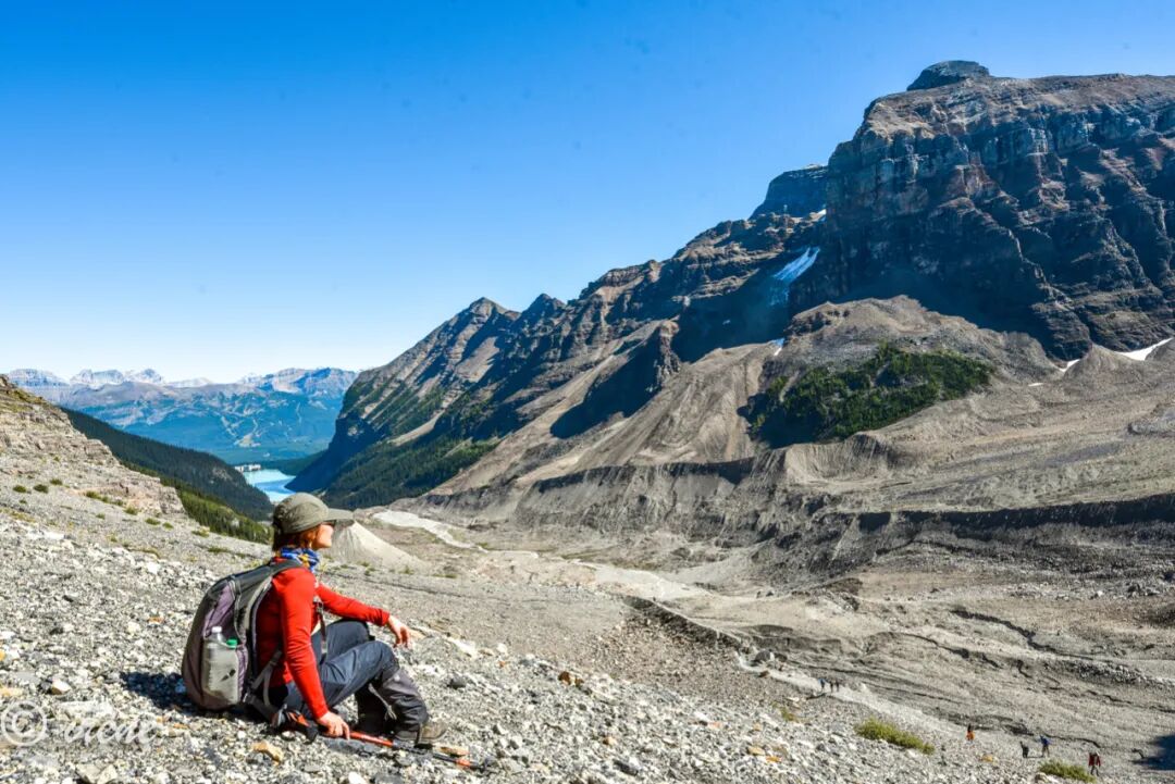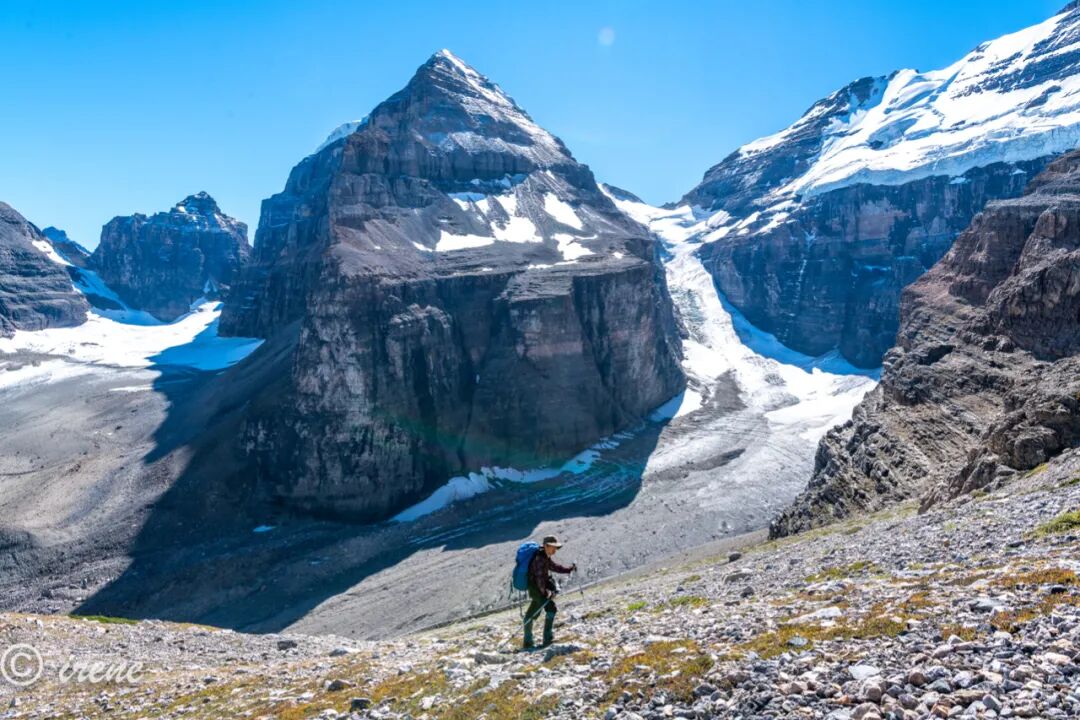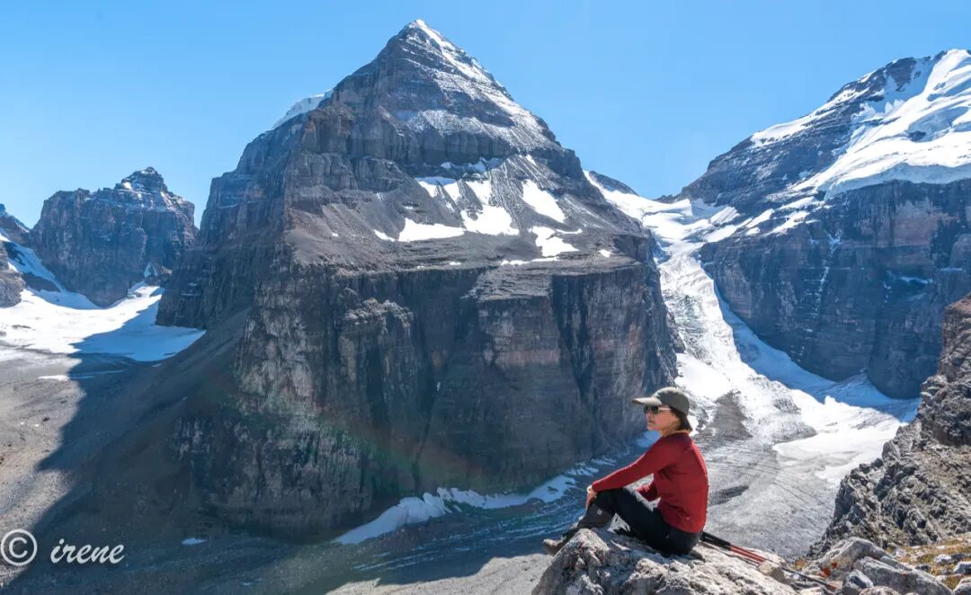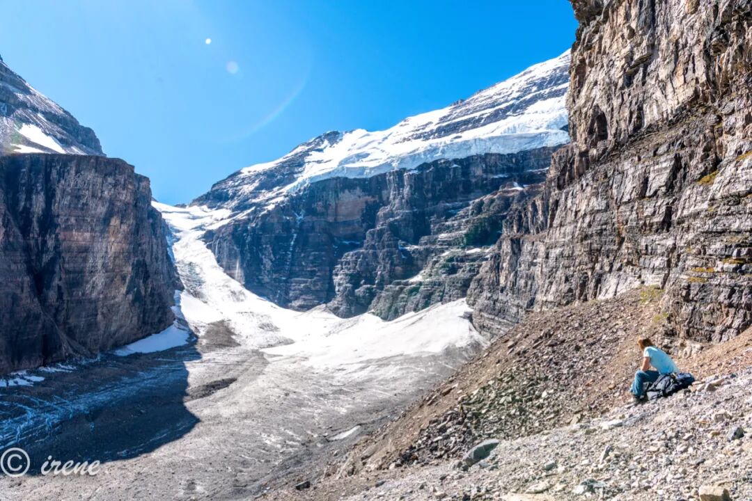 午餐过后,我们继续上行直到阿博特垭口观景点(Abbot Pass viewpoint),这里不仅可以近距离观赏冰川还可以看到建于1922年,加拿大海拔第二高的山屋,阿博特山屋(Abbot Pass Hut)
