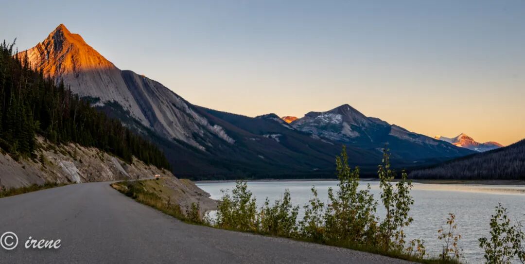 回程在医药湖畔(Medicine Lake)又见证了夕阳的日照金山,完美!