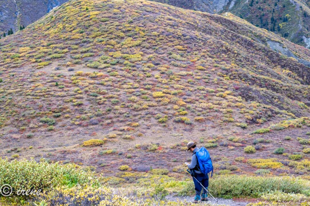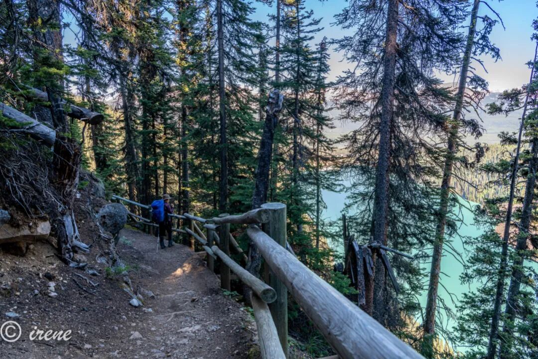 下到了树线以下,步道口告示有熊出没,熊喷随时拿在手上,一路高歌,就是告诉熊我来了,和坐在车里不一样,还是不要遭遇吧。