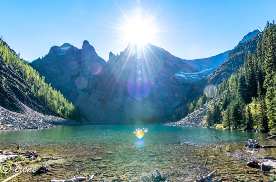 再上到艾格尼丝湖(Lake Agnes),太阳正好站在山头,圣洁、纯净、清幽。不知道湖上的精灵怎么就跳进了我的镜头。