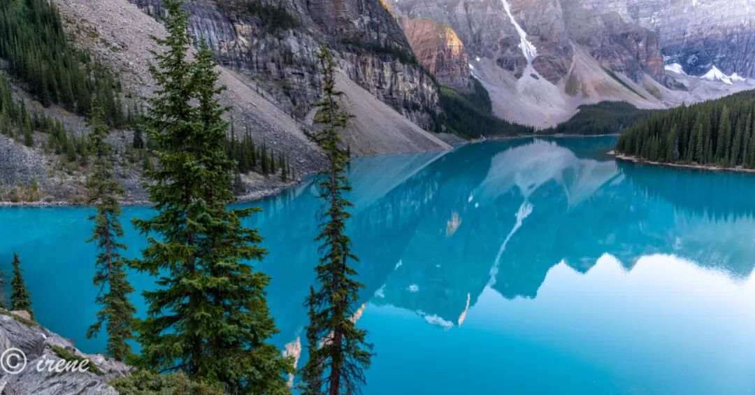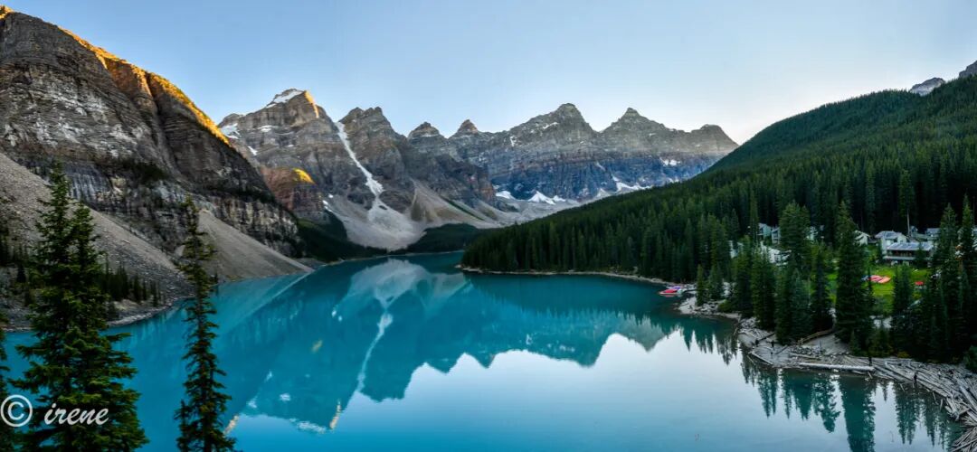 看时间正好,到梦莲湖(Moraine Lake)去看夕阳。这里清晨和白天都限行,因为太热门,根本停不了车,现在进去已经不用排长队等车位了。
