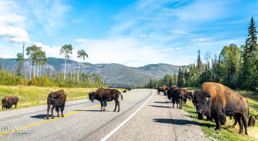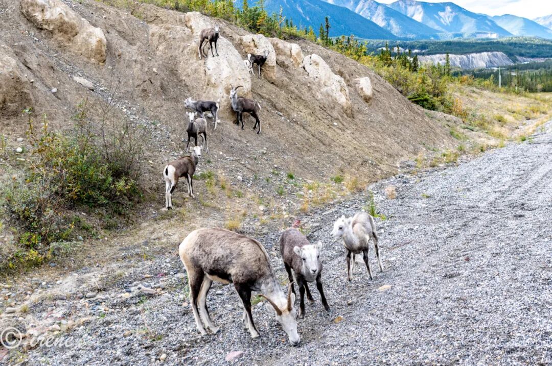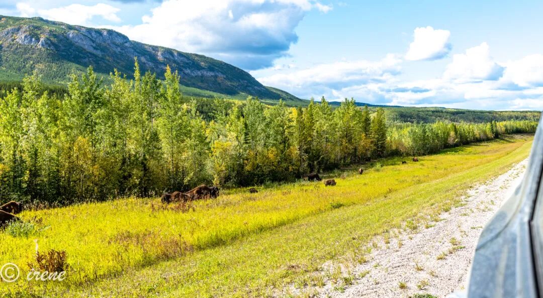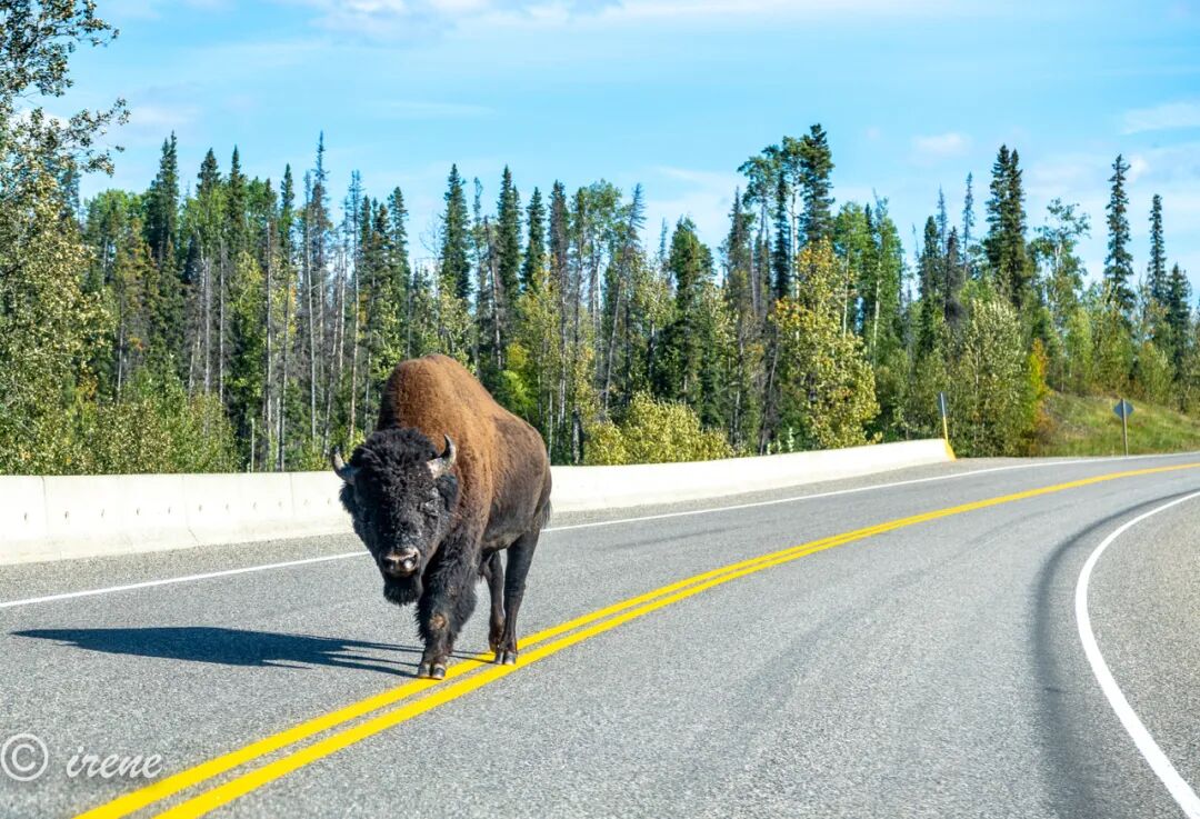 从沃森湖镇出来一路简直就是在逛野生动物园啊。野牛成群结队,山羊在路边蹦蹦跳跳,黑熊也出来凑热闹,狐狸黑的、灰的、黄的在育空看到了7、8个,居然在这个路边也看到,小鹿更是少不了。自此我们已经看到了26只熊,野牛,山羊什么的都数不过来了。