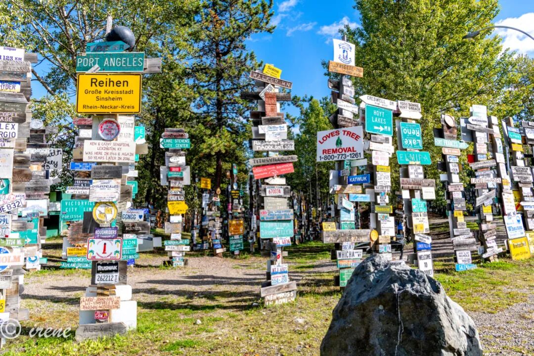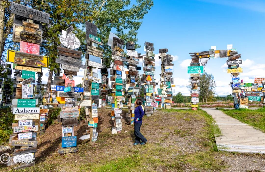 沃森湖镇是育空的一个人口不到一千人的小镇,也是阿拉斯加高速路的976.4公里处,并以其标牌森林(Sign Forest)而闻名于世。事件起源于1942年,二战中,美国军队建起了这条通过加拿大连接美国本土和阿拉斯加的公里,一个修路的士兵思乡心切,就在路牌的边上立了一块牌子,上面写上了家乡的名字和距离,不曾想勾起了许许多多人的思乡之情,纷纷把自己家乡的牌子立到了这里,包括后来的旅游者。牌子越来越多,成了一道独特的景观,现在大约有了65000块牌子了。