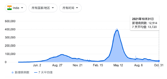 与此同时,印度的疫情也在大幅好转,从最高峰时期的日增40万例,变成如今的日增一万多例。