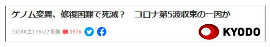但随后,日本国立研究所和新潟大学的研究团队共同发现,8月下旬的疫情高峰钱,Delta病毒出现了新变异,导致一种名叫“nsp14”的酶无法正常运作,这种酶是新冠病毒用作修复基因变异的。这种酶的缺失,导致新冠病毒不能自我修复,无法扩大感染,最终大量死亡。