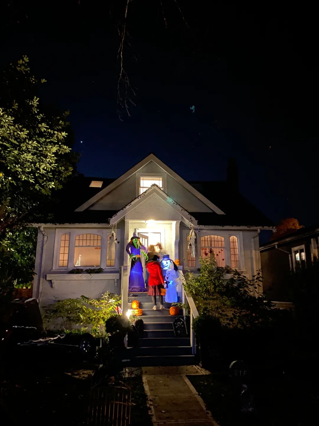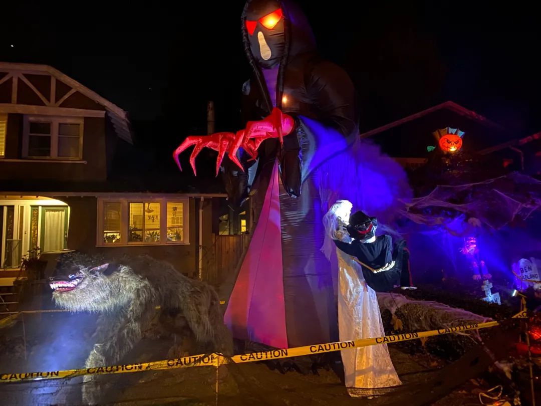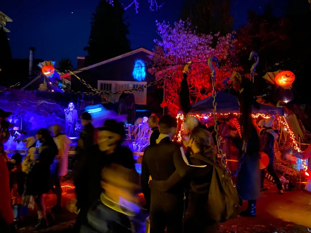 名不虚传的打卡地从未令人失望,每年都有新的陈设,满院子的墓碑、怪兽、十字架,屋前墙壁上放着蓝黢黢的恐怖投影,一条绳索从屋顶拉到院子门口的地上,每隔几分钟,绳索上一个白色鬼魅呼啸而来,引起孩子们一片尖叫。家人们都很忙,有发糖的,有穿着制服坐在地上与孩子们做游戏的,有拿着笨重的喷雾设备不停释放烟雾的,也有身穿黑色衣服静坐的。记得前两年这家的老爷爷缓缓从棺材里爬出来休息,令人惊叹,原来棺材板下露出的胳膊竟然是真人秀。这家人仍像往年那样体贴,在门前放置了休息的座椅,只是与以往不同的是,座椅间隔按照防疫要求摆放,总算提醒人们我们还在疫情里。孩子们都在近处仔细欣赏,大人们则在人行道靠后处站着聊天,拍照,热闹极了。旁边的邻居挨着这家想来也是有压力的,也竖着几个巨大的充气鬼怪,看来万圣节装饰也是会内卷的。