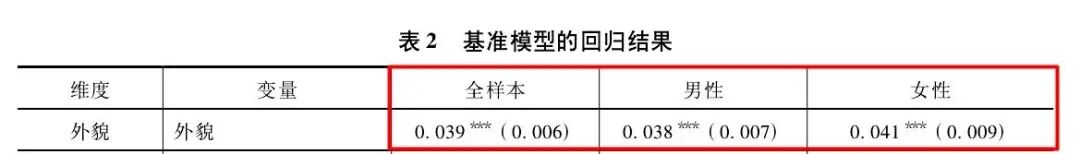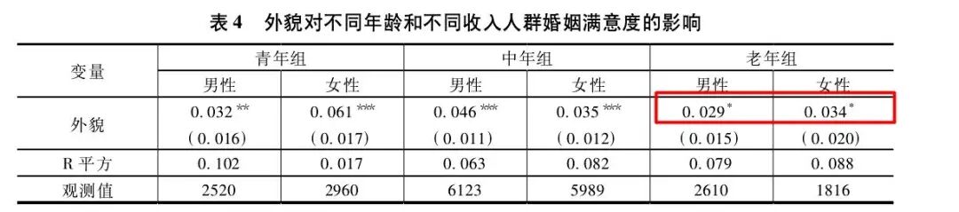 研究者通过探索北京大学中国社会科学调查中心实施的中国家庭追踪调查(CFPS) 2014 年数据,发现外貌对婚姻满意度具有显著正向影响(全样本),不同年龄的影响效果存在异质性,但老年组也依然在10%水平上显著。