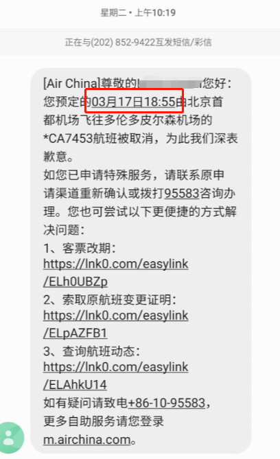 据多伦多华人网友消息,近期已经出现航班被取消的情况。Y女士给国内母亲于9月1日订购的明年3月17日的国航单程机票,航班号为CA7453,突然在上周二被通知航班取消,被迫改期。不知道会不会有更多的“坏消息”传来!