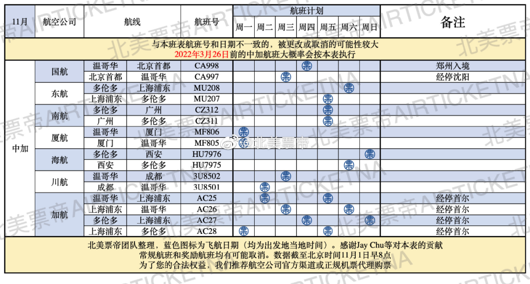 根据中国民航局发布的新一季冬春航班计划,国内各大航空公司陆续更新了航班表。小编梳理发现,很多航空公司11月份的中加航班未出现明显调整,具体如下: