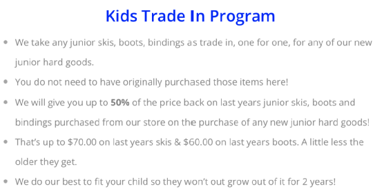 是一家专门出售Ski的商店,没有snowboard出售。但值得一提的是,该店提供儿童雪具trade in 服务,没有品牌的限制,只是在本店购买的雪具可以获得更高trade in价格。