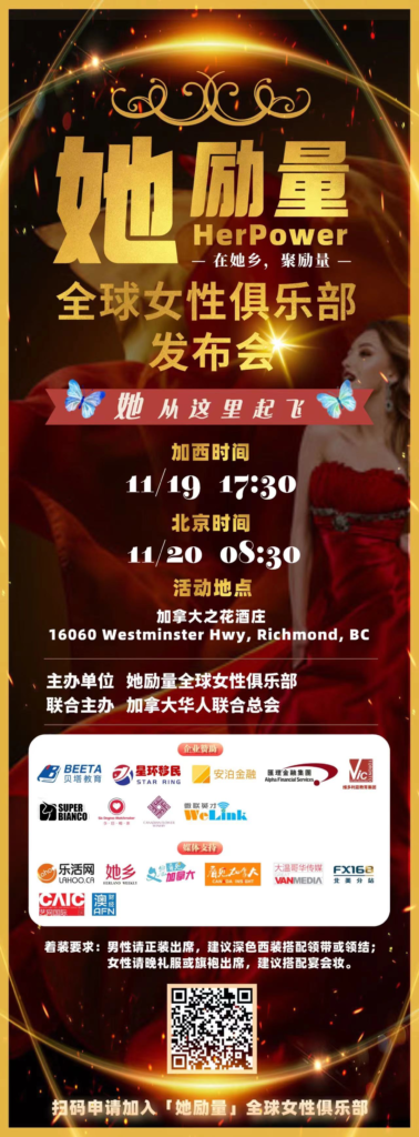 在大温最美丽、最浪漫的深秋时节,「她励量全球女性俱乐部」将举办一系列庆祝活动,让“她从这里起飞”!在她乡,聚励量,11月19日HerPower她励量全球发布会,势必掀起一轮秋天的热浪!