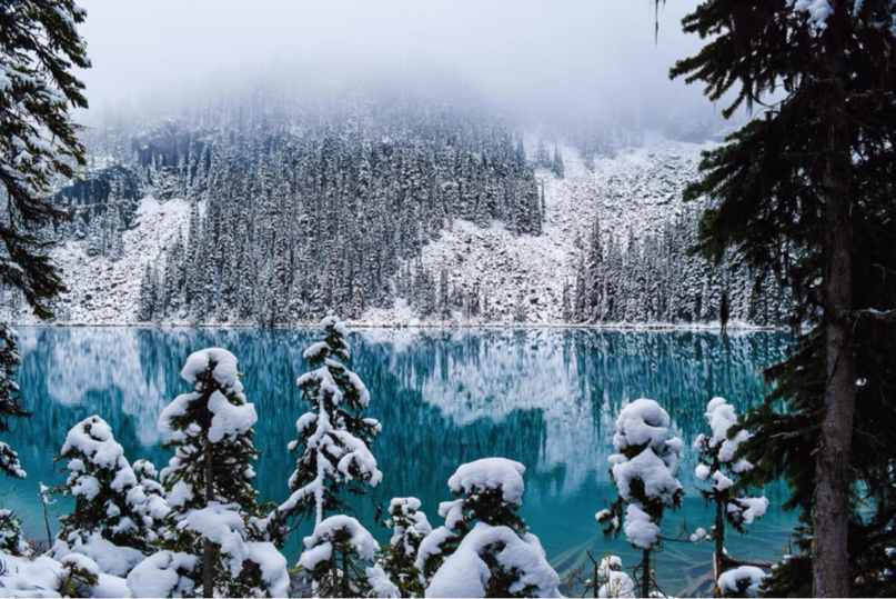 乔佛里湖是颇受人们欢迎的拍照胜地,游客人数很多,车流量也很大,尤其是在繁忙的夏季。在冬季,当高耸的山峰被白雪覆盖,树木披上一层淡淡的白色,乔佛里湖就变成了一个冬日仙境。