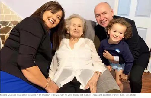 这个男孩就是骆嘉鹰(Ellis Ross),一个普通的原住民居民,BC省自由党党团核心成员、党领候选人,BC省议员,两届海斯拉民族委员会首席议员,伊丽莎白女王二世钻石禧年获得者,BC省最高荣誉——不列颠哥伦比亚勋章获得者,简蕙芝内阁成员、天然气开发部长和住房部长……
