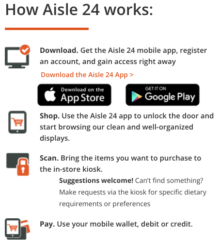 它的运作方式相当简单,因为所有的商店都是无人值守的,顾客必须下载 Aisle 24 应用程序并注册一个账户,以获得进入商店的权利。然后,他们可以选购需要的商品,并使用自助式结账来支付(手机钱包、信用卡或借记卡)。