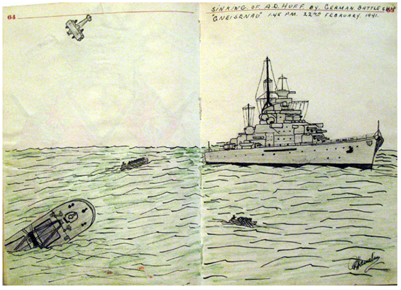 (这些画出自蒙特利尔的 Romeo Hamelin 的战时日志,他也曾是 AD Huff 上的船员,船沉后被俘)