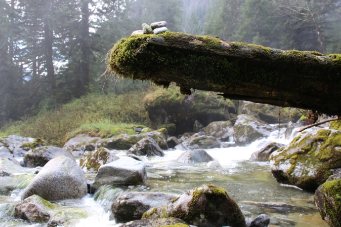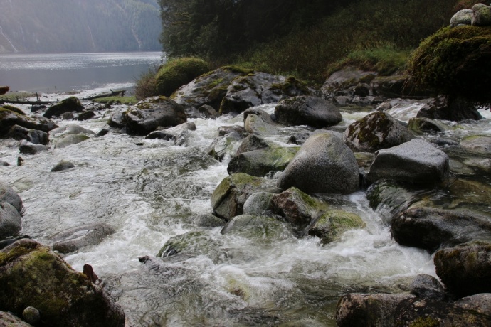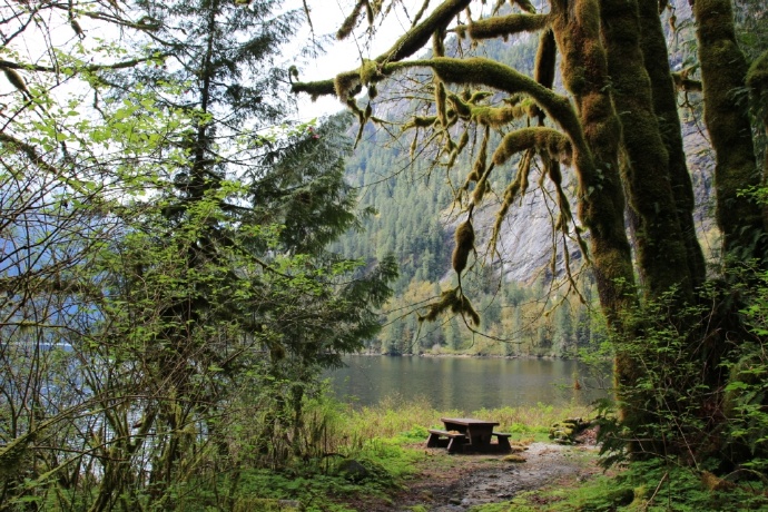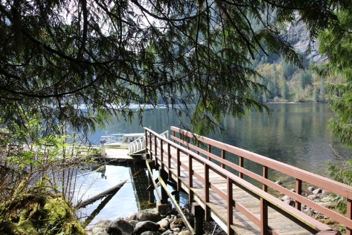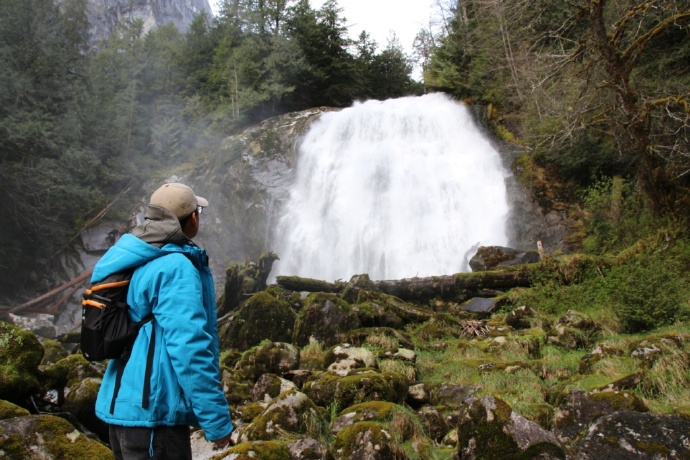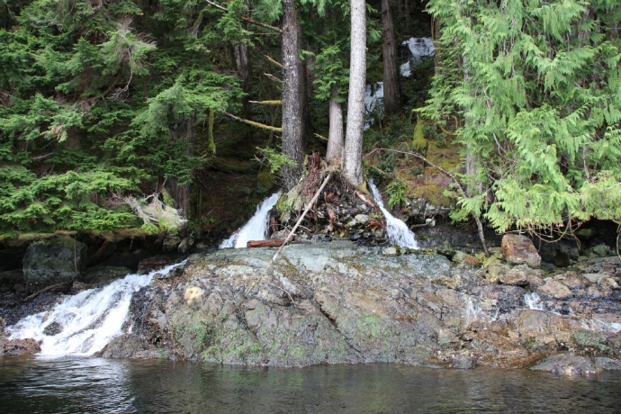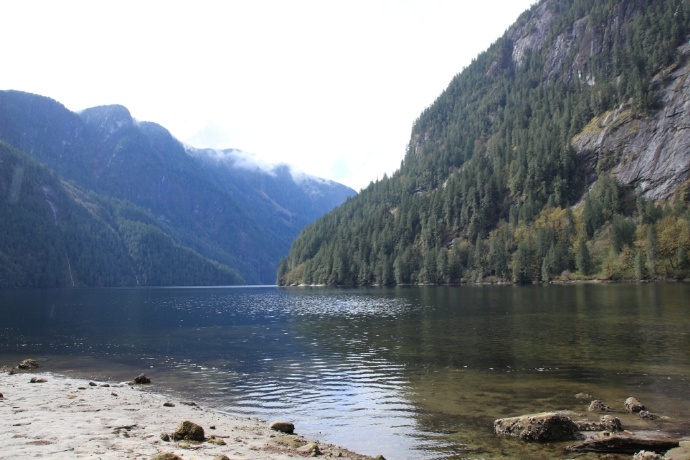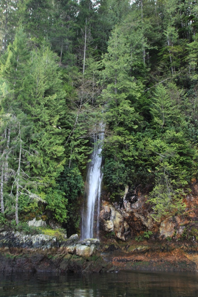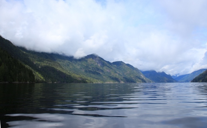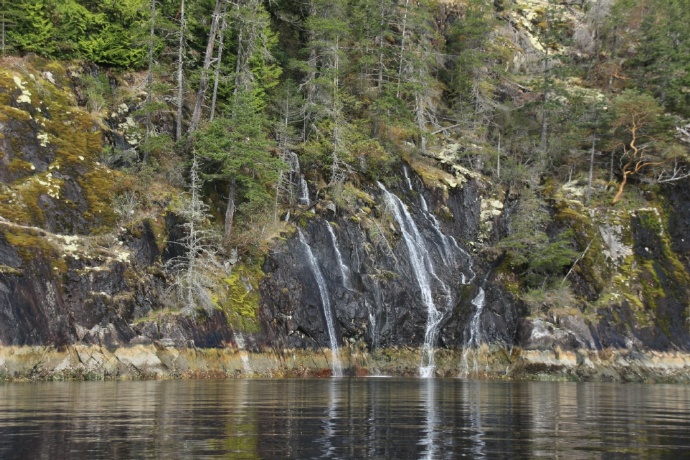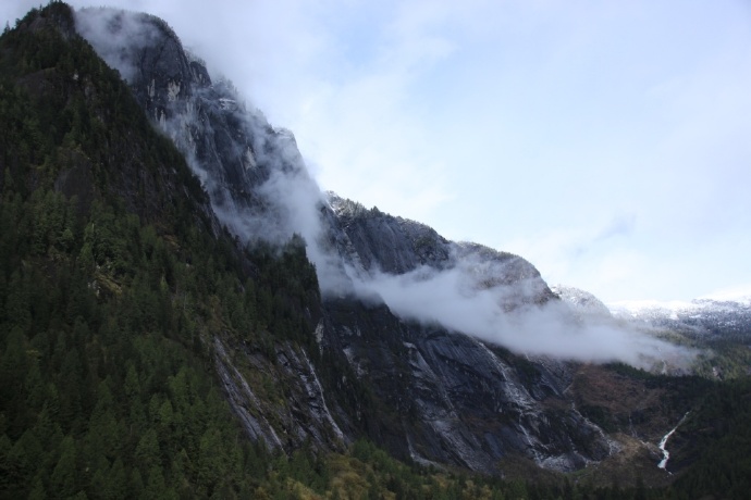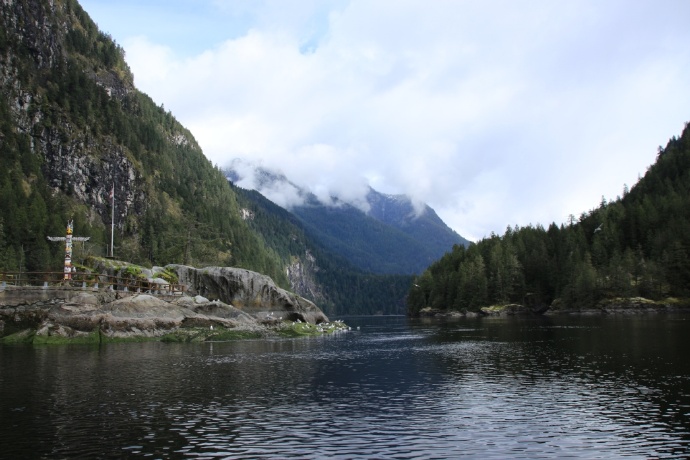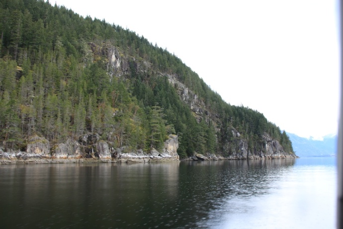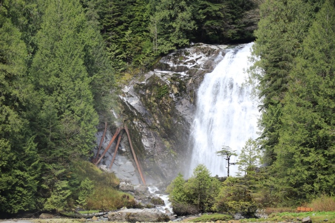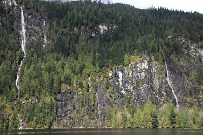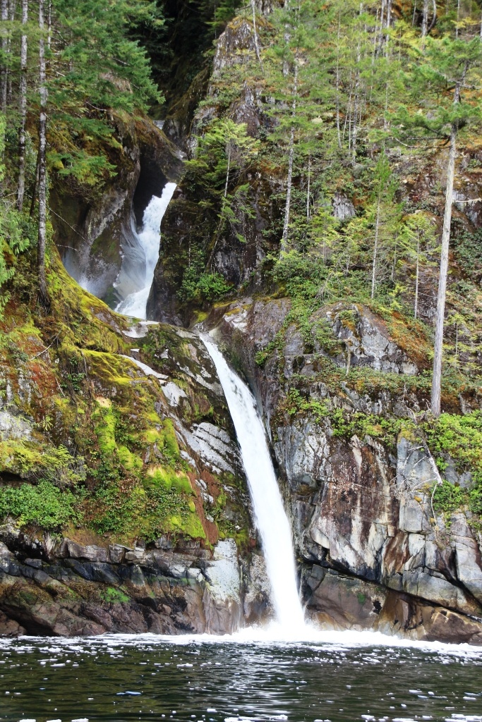 两岸皆是海拔两千米以上的山峰耸立,难以尽数的瀑布飞流直下,山顶云雾缭绕。峡湾的尽头就是ChatterboxFalls,不高,水量巨大。这一片原先是James MacDonald的私人产业,他过世时捐给了路易莎公主峡湾慈善机构,后来交由省政府成立Princess Louisa Inlet 省立公园: