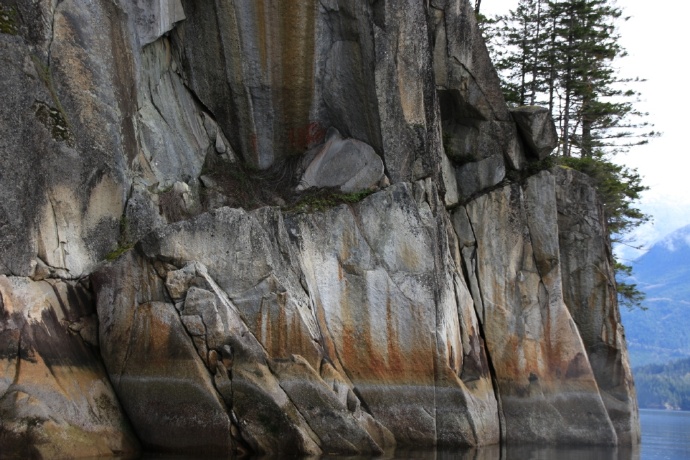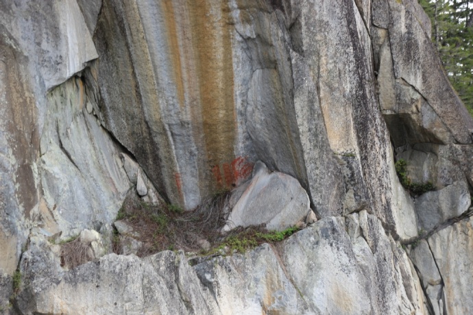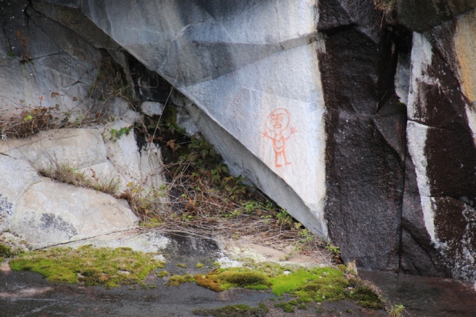 船长沿途慢慢解说这一带的历史人文。这里原来是Sechelt部族的夏天领地,当时的几个村庄还留下了一些遗址。原来阳光海岸离惠斯勒不算远,他们曾翻山越岭去惠斯勒做物物交换的生意。岩壁上原住民留下的岩画,其中一幅是和他们打猎祭祀有关,不远处就是他们的祭祀地的绝壁;