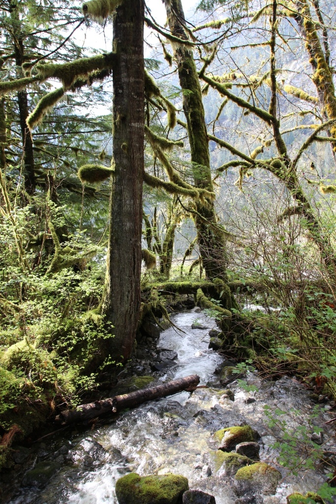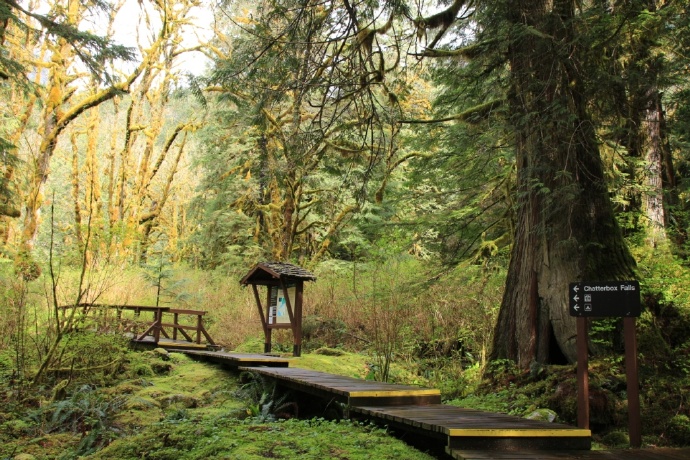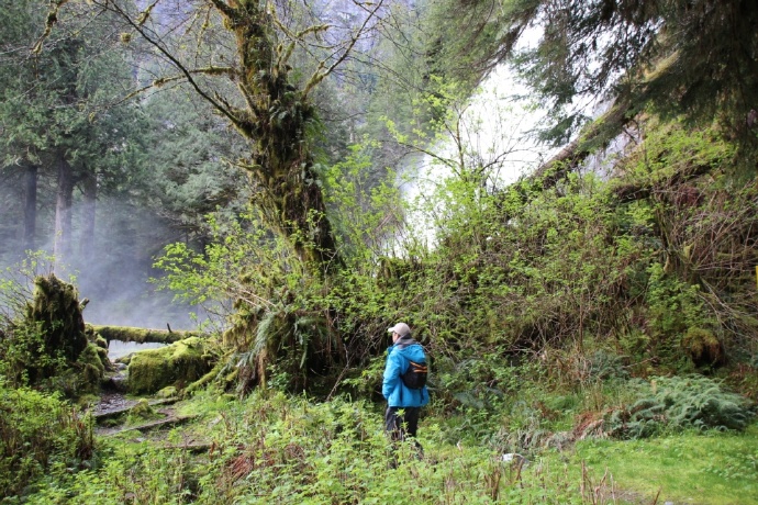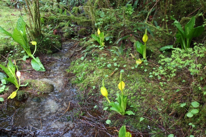 通往Chatterbox瀑布的小径保留着温带雨林的古木参天,和非常潮湿的海岸淡水湿地生态。青苔覆盖到处,鲜黄色的水芭蕉(SkunkCabbage)开在春天里:
