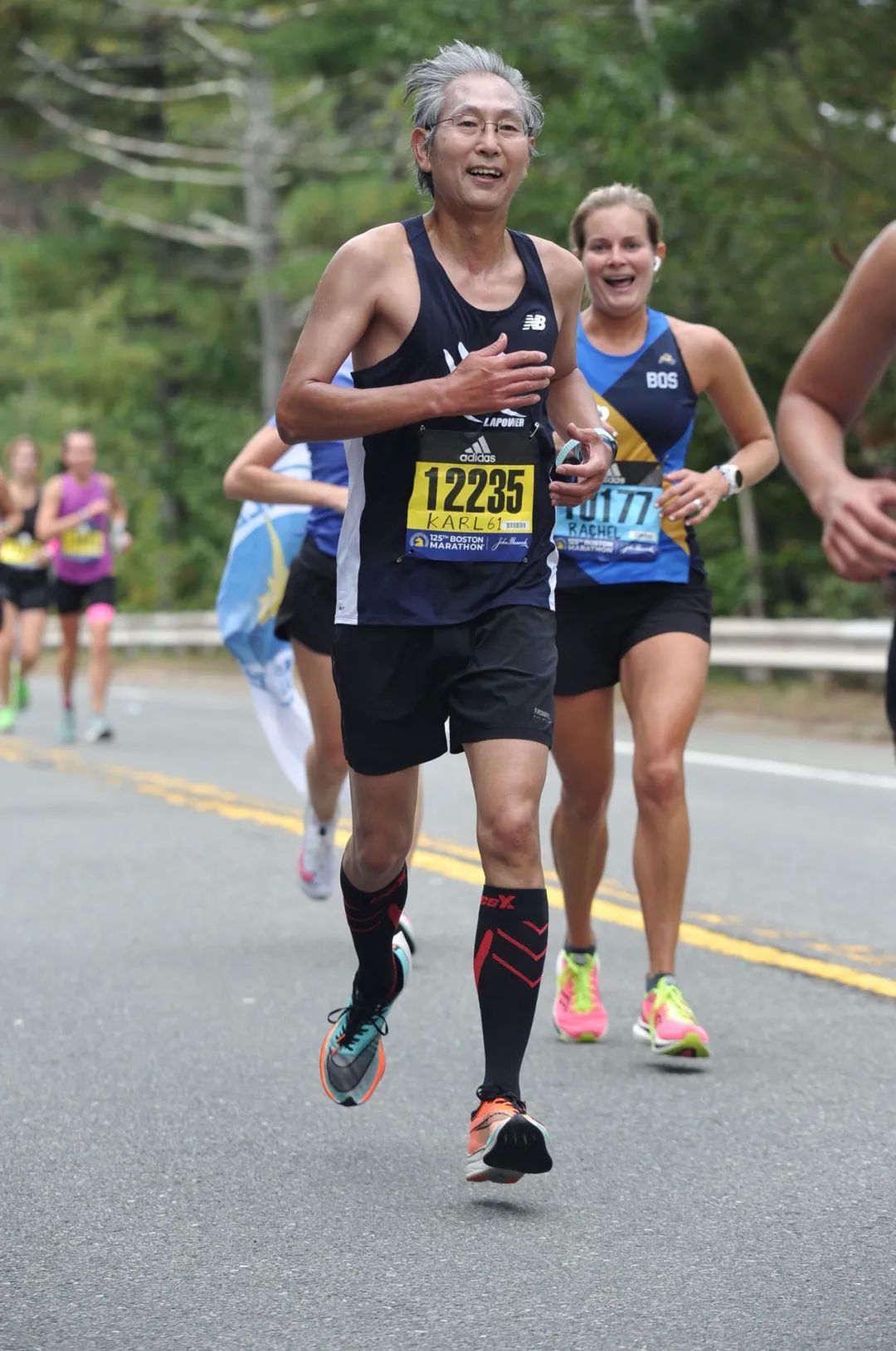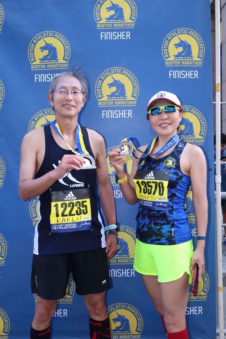 Karl(左)和Mary(右)在波士顿马拉松上取得傲人成绩