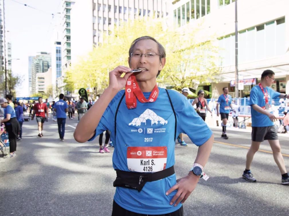 2017年,Karl以56岁的年龄在BMO温哥华马拉松赛上完成了人生中第一场马拉松比赛。