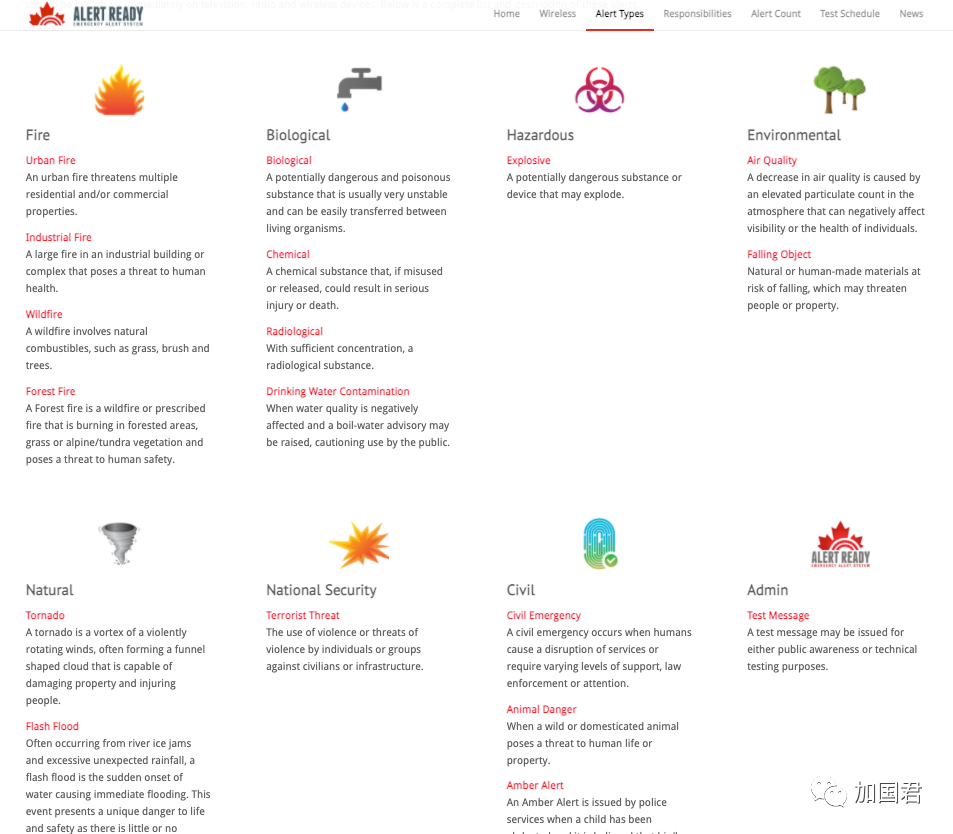 Alert Ready警报是国家公共警报系统,设计有7个类别的警报。