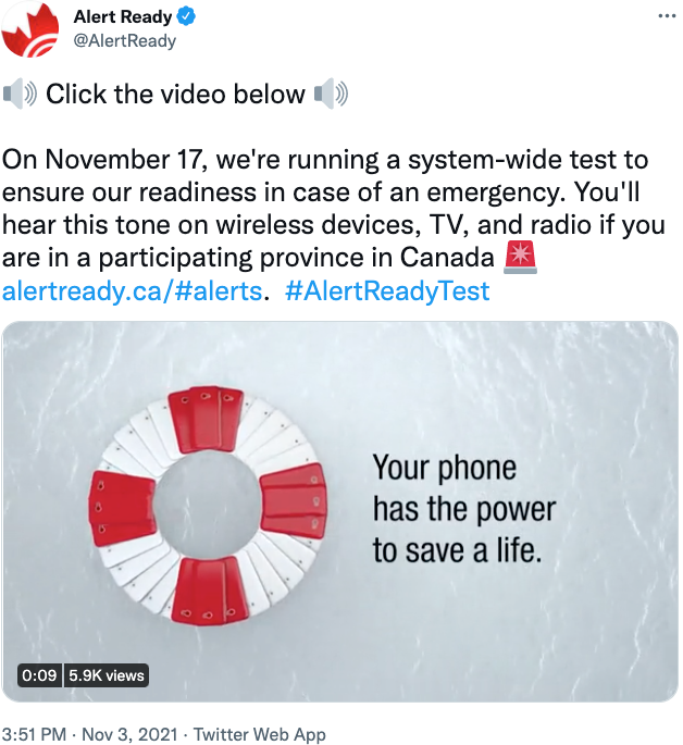 加拿大联邦政府计划于 2021 年 11 月 17 日进行一次全国性质的Alert Ready紧急警报测试,届时,所有人的手机都会大声尖叫,大家要注意别给吓到。