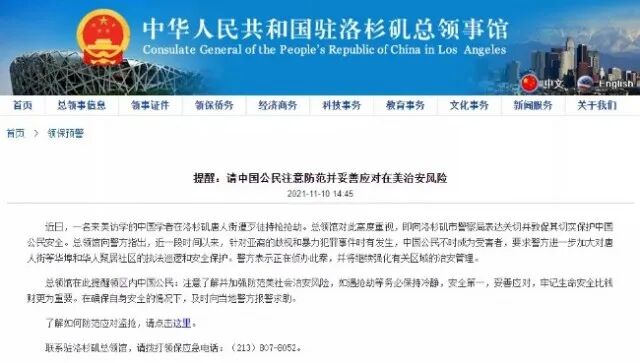 洛杉矶总领馆在声明中说,近日,一名来美访学的中国学者在洛杉矶唐人街遭歹徒持枪抢劫。总领馆对此高度重视,即向洛杉矶市警察局表达关切并敦促其切实保护中国公民安全。